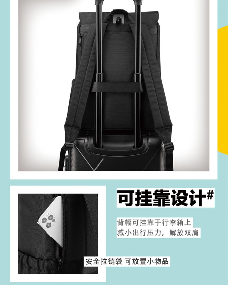 3、可挂靠设计,背幅可挂靠于行李箱上,解放双肩